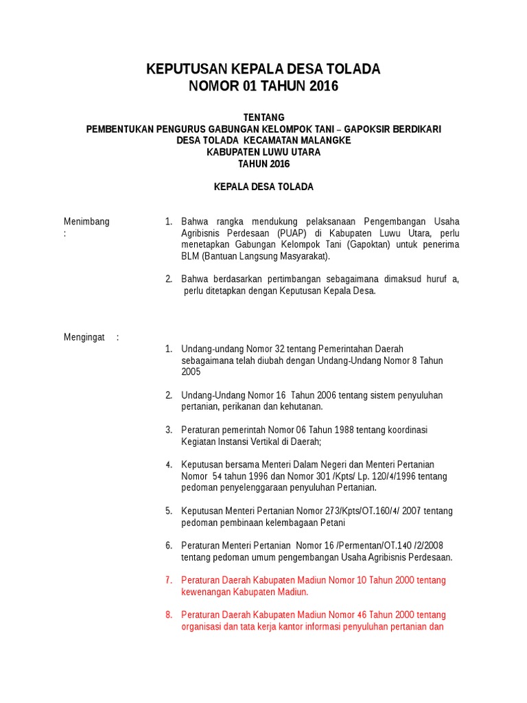 Berikut ini kumpulan format terbaru sk kepala desa, baik format pdf maupun doc (word). Bagaimana cara pembentukan kelompok tani ternak yang baik dan benar : Kata pengantar alhamdulillahirobbil'alamin saat ini kelompok ternak sapi lembah benggolo telah berhasil menyusun angaran dasar dan anggaran rumah tangga ( ad/art). Sk pengurus gapoktan tani mulya periode 2015 2018 gapoktan tani kelompok tani ternak 3 surat keputusan kepala desa tentang pembentukan kelompok. Bahwa dalam rangka pelaksanaan kegiatan pangan desa program peningkatan ketahanan pangan perlu menunjuk/menetapkan pengurus kelompok tani,sehingga pelaksanaan operasional dilapangan efektif dan lancar.